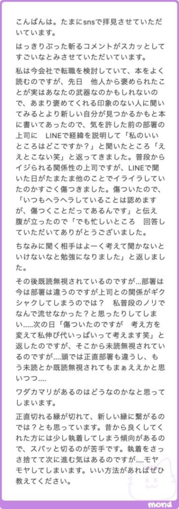 >と本に書いてあったので、気を許した前の部署の上司に LINEで経緯を説明して「私のいいところはどこですか?」と聞いたところ