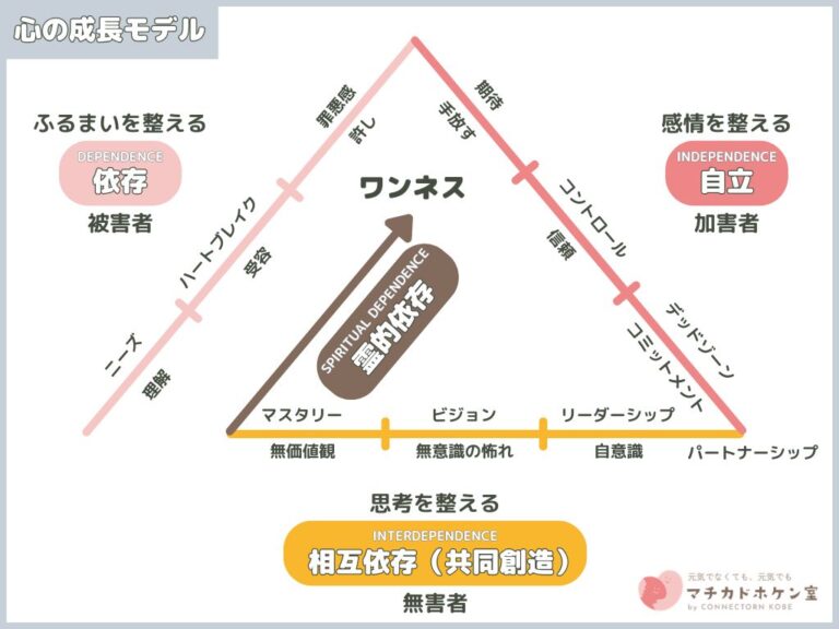 人は、自分一人では何もできない生まれたての「依存」のステージ、ちょっと成長して独り立ちできる「自立」のステージ、そして支えあう「相互依存」のステージへと辿り着きます。